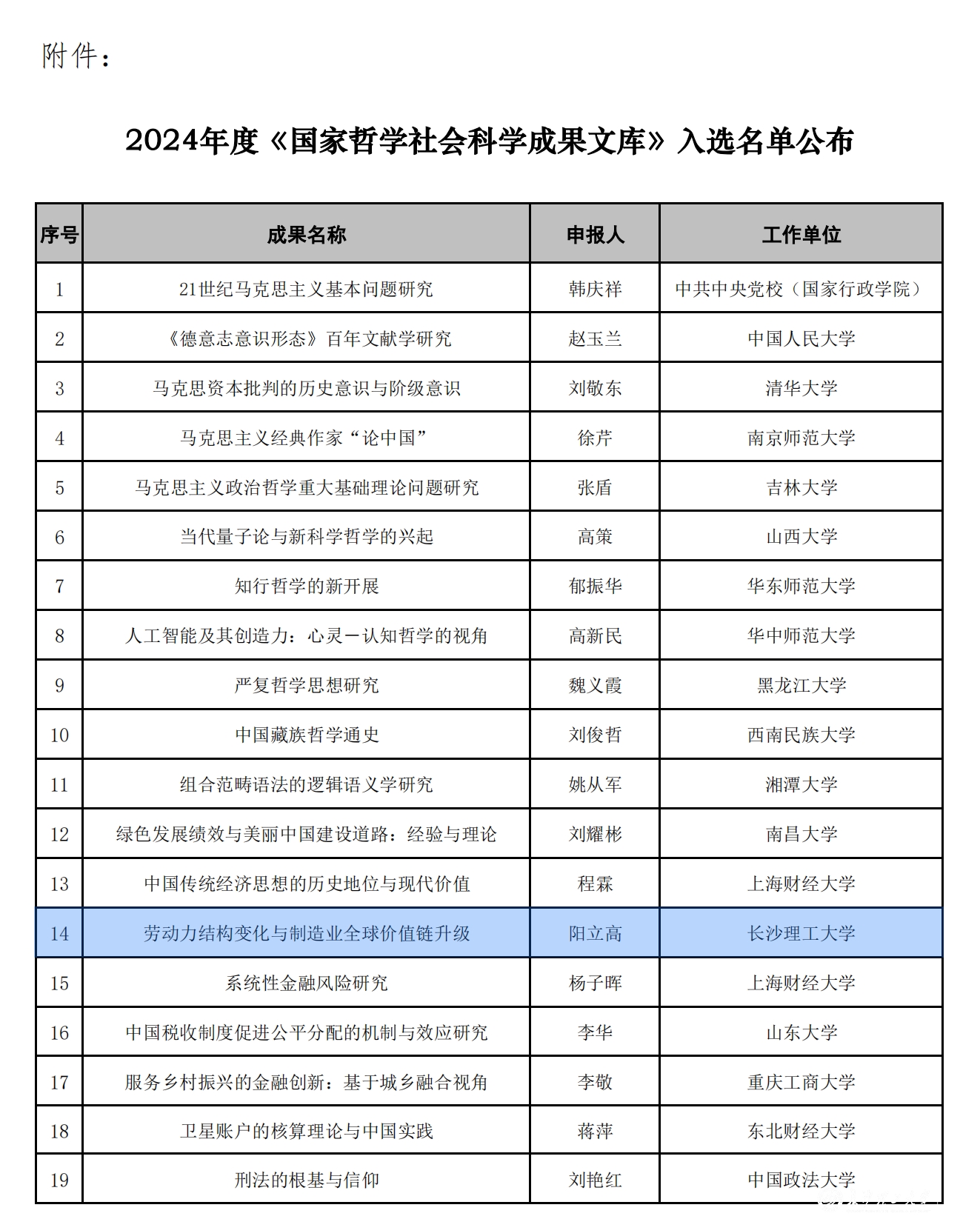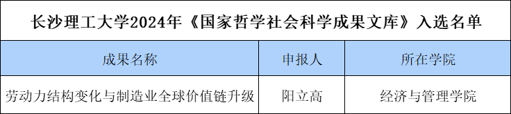 近日,全国哲学社会科学工作办公室公布了2024年度《国家哲学社会科学成果文库》入选名单,我校阳立高教授的成果《劳动力结构变化与制造业全球价值链升级》入选。