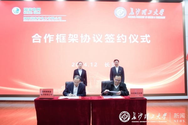 国网湖南省电力有限公司副总经理、党委委员张孝军,我校党委委员、副校长刘朝晖分别代表公司和学校签订合作框架协议。