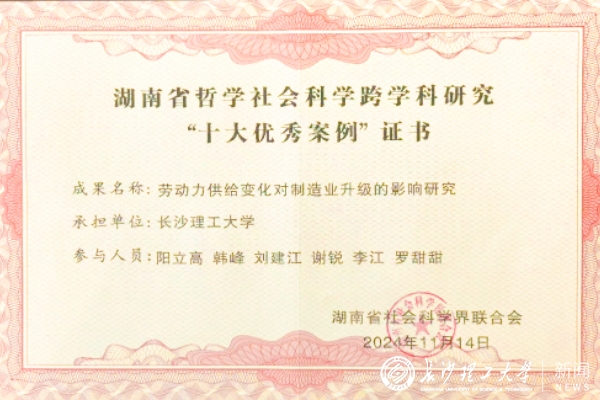 近日,湖南省社会科学界联合会公布了湖南省哲学社会科学跨学科研究“十大优秀案例”和“十大案例”名单,我校阳立高教授的研究成果《劳动力供给变化对制造业升级的影响研究》和杨洪明教授的研究成果《用户电能替代和分布式资源协同发展的低碳能源产业链模式研究》分别荣获湖南省哲学社会科学跨学科研究“十大优秀案例”和“十大案例”。