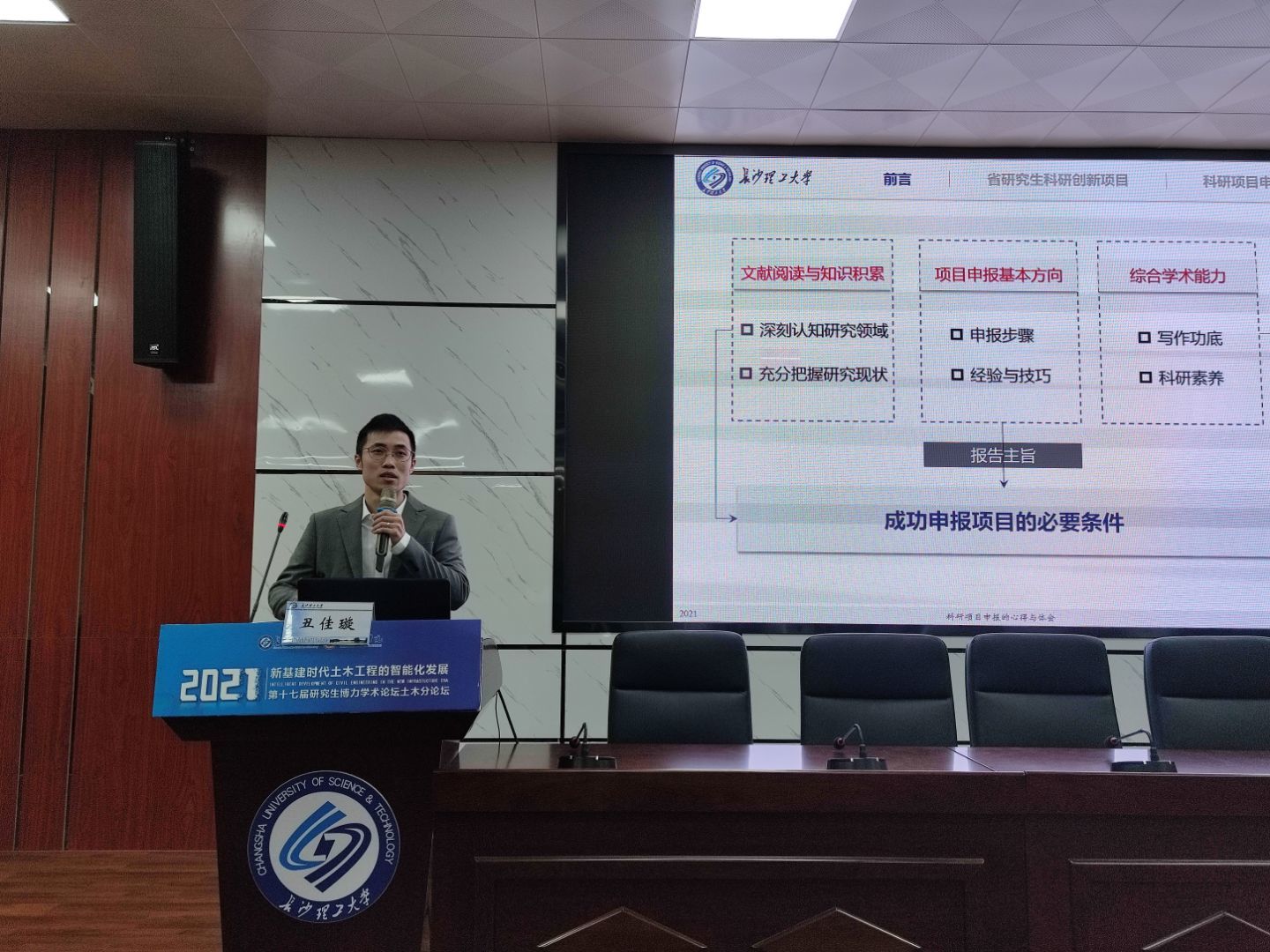 11月24日,土木工程学院博力学术论坛系列活动之“博士有约”(第六期)学术沙龙在金盆岭校区四教学术报告厅举行。学院博士研究生丑佳璇应邀主讲,学工办助管赵爱华及200余名硕士研究生参加活动,院研会副主席刘羊城主持会议。