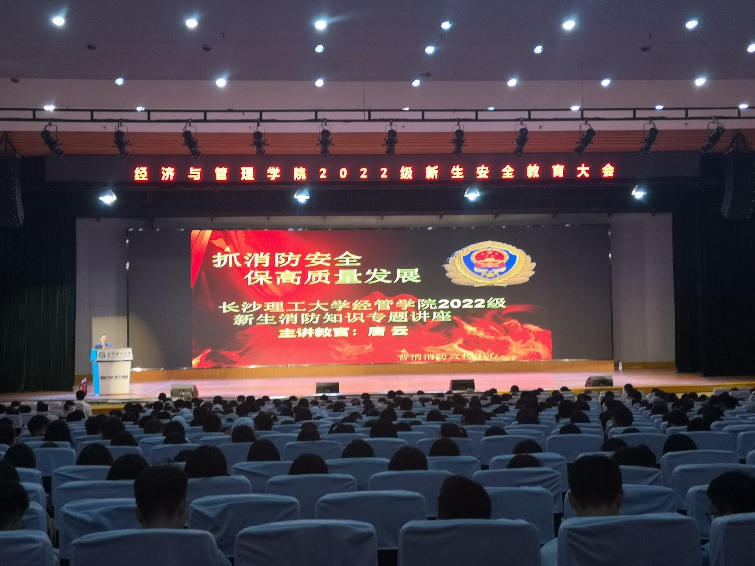 为全力打造平安和谐校园,坚决遏制火灾隐患问题,进一步提高学生的消防安全意识和自防自救能力,帮助新生更好地融入大学生活,10月13日晚经管学院在金盆岭校区五教大礼堂组织召开2022级新生安全教育大会。君消消防中心唐云教官,学院党委副书记唐青,新生辅导员叶鑫、何涛,研究生辅导员吴畏,以及全体本科和研究生新生参加会议。