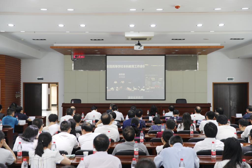 6月21日,教育部在四川成都召开新时代全国高等学校本科教育工作会议,在四川大学设主会场,我校设分会场。下午3点在一办公楼9楼会议室,副校长蒋昌波,学工部、规划法规处、团委、招就处、信息化中心、高教所、工训中心、心理中心主要负责人,各学院院长、教学副院长、系主任、教务办主任、教师代表,教务处全体人员,校教学督导团团长等200余人参加会议。