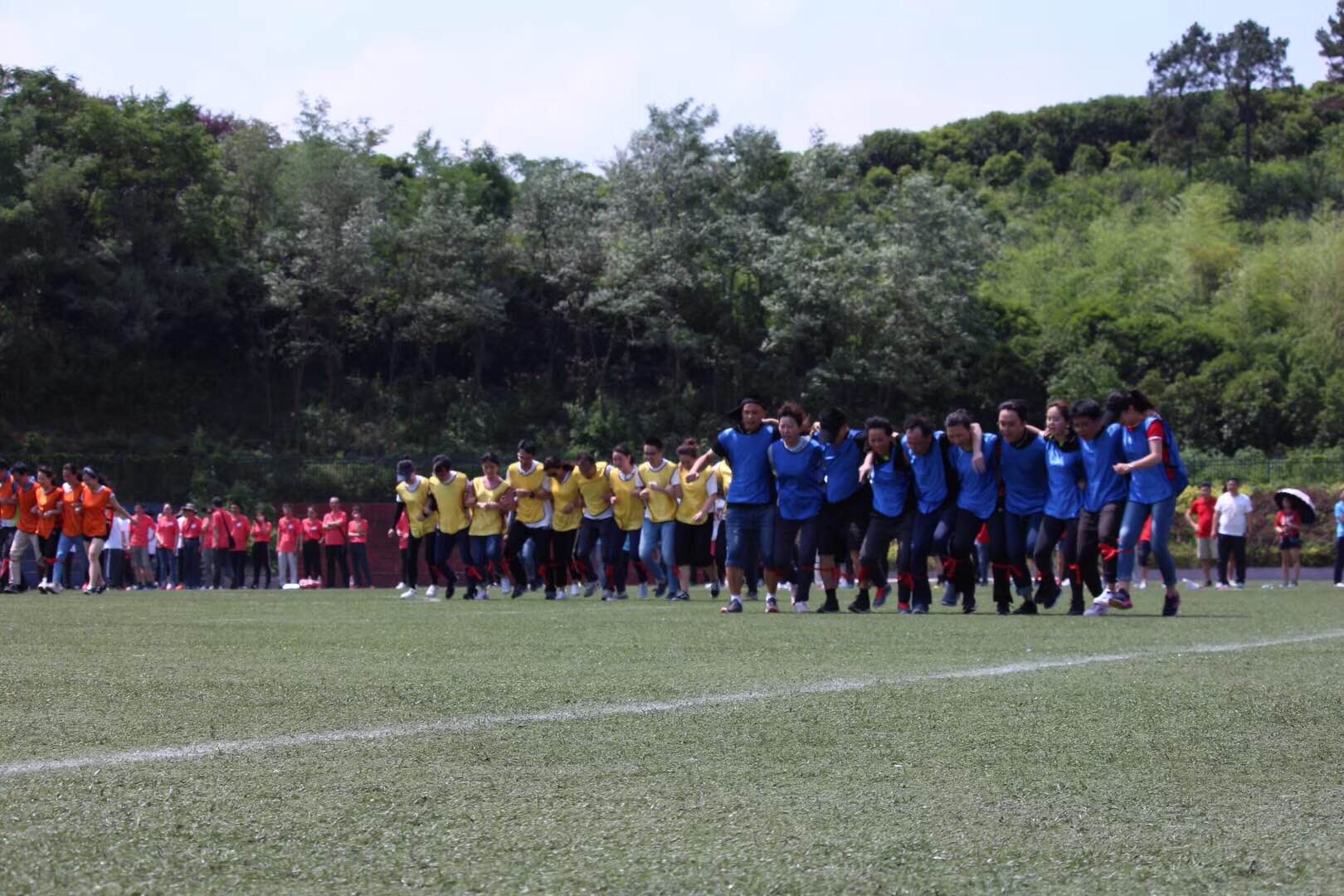 本届趣味运动会设置了十人十一足、跳长绳、一圈到底、袋鼠跳、迎面接力五个比赛项目。经过各二级分工会精心组织,全校25个分工会、122支队伍、2190人次参加。各二级分工会教职工冒着35度的高温顶着烈日参赛,参与热情空前高涨,大家手挽着手、肩并着肩、齐心协力完成十人十一足、一圈到底等项目。在进行袋鼠跳、迎面接力项目时,大家互相鼓励、默契配合、摔倒了立刻爬起来继续跑,这种不畏强手、奋勇争先、重在参与的氛围感染着运动场上的每一个人。经过激烈拼搏,体育学院分工会勇夺冠军,资产公司分工会获得亚军,后勤集团分工会获得第三名,艺术学院分工会获得第四名,土木学院分工会获得第五名,汽机学院分工会获得第六名。