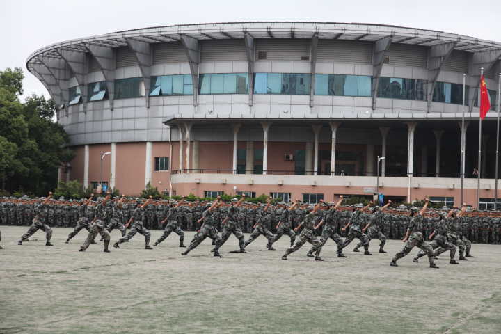 伴随着庄严的国歌声,五星红旗冉冉升起,大会正式拉开帷幕。带训教官匕首操、2018级新生的擒敌拳表演和战术动作展示凌厉有力、气势恢宏,现场掌声不断。