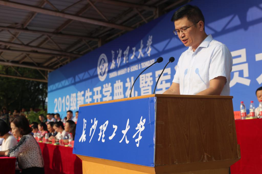 9月9日上午,2019级本科新生开学典礼暨军训动员大会在金盆岭校区田径场隆重举行。校长曹一家,校党委副书记邹宏如,副校长黄立宏、谈传生,纪委书记胡永乐,副校长蒋昌波、刘扬,党委委员付嫦娥、齐路良、方琼出席,职能部门负责人、学院党政主要负责人、2019级新生辅导员及全体2019级本科生参加了大会。开学典礼暨军训动员大会由谈传生主持。