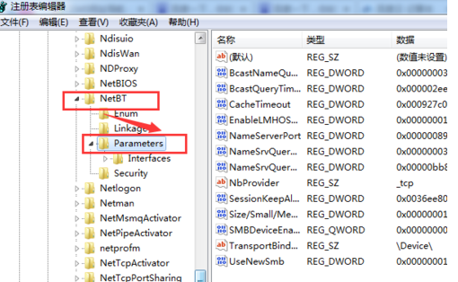 依次点击注册表选项“HKEY_LOCAL_MACHINE\SYSTEM\CurrentControlSet\services\NetBT\Parameters”,进入NetBT这个服务的相关注册表项;