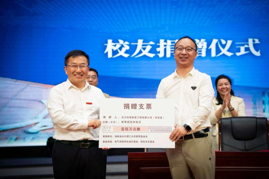?9月23日,电气与信息工程学院1999届校友、长沙科智防雷工程有限公司董事长兼总经理郑智勇捐赠仪式在2025级新生“电苑第一课”现场举行。副校长张军辉出席并讲话,校友中心、教育基金会、学工部、校团委、电气学院等相关单位负责人参加。张军辉代表学校向郑智勇先生致以感谢。他表示,“校友的成就,是母校最骄傲的名片;校友的回馈,是对教育最深情的反哺。”他鼓励全体新生以优秀校友为榜样,珍惜韶华、锤炼本领,成长为具有...