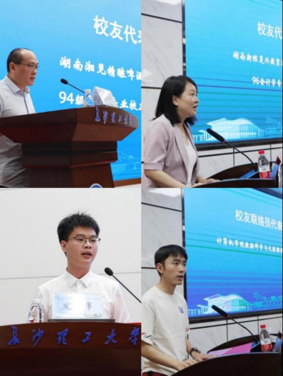 校友中心主任唐青详细介绍了我校校友会的职能、发展历程以及地方分会建设,发布了校友综合服务平台新功能。校友中心吴焰辉老师介绍了校友联络员工作职责和内容。95级汉语言文学专业校友曾高飞心系母校,向学校捐赠价值30万元的图书6000册。湖南湘见精酿啤酒有限公司董事长、食品与生物工程学院94级发酵专业校友廖辉旭以及校友促进经济发展专业委员会秘书长、96级财经系校友张见作为校友代表发言。电气学院智能电网2102班的王晋韬、计算机学院数据科学与大数据技术2101班的顾永彤作为校友联络员代表发言。