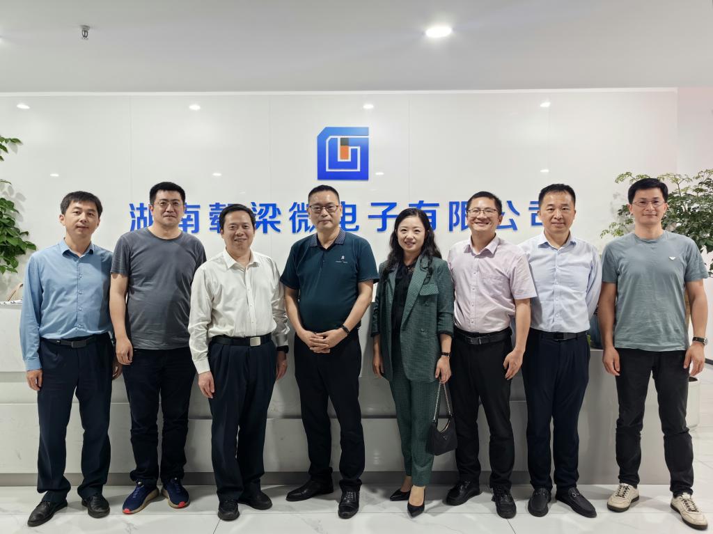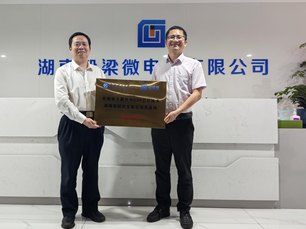 2023年5月25日下午,太阳成集团tyc122cc入口物理与电子科学学院党委书记张国强、副院长(主持工作)张卫兵、电子信息系主任邹望辉、研究生院副院长(研工部部长)闾兰一行前往湖南毂梁微电子有限公司调研研究生联合培养情况,并举行了车规电子器件与DSP芯片技术湖南省研究生联合培养基地授牌仪式。湖南毂梁微电子有限公司副总经理杨一艺、汪东、陈虎、首席科学家李振涛等公司负责人参加相关活动。