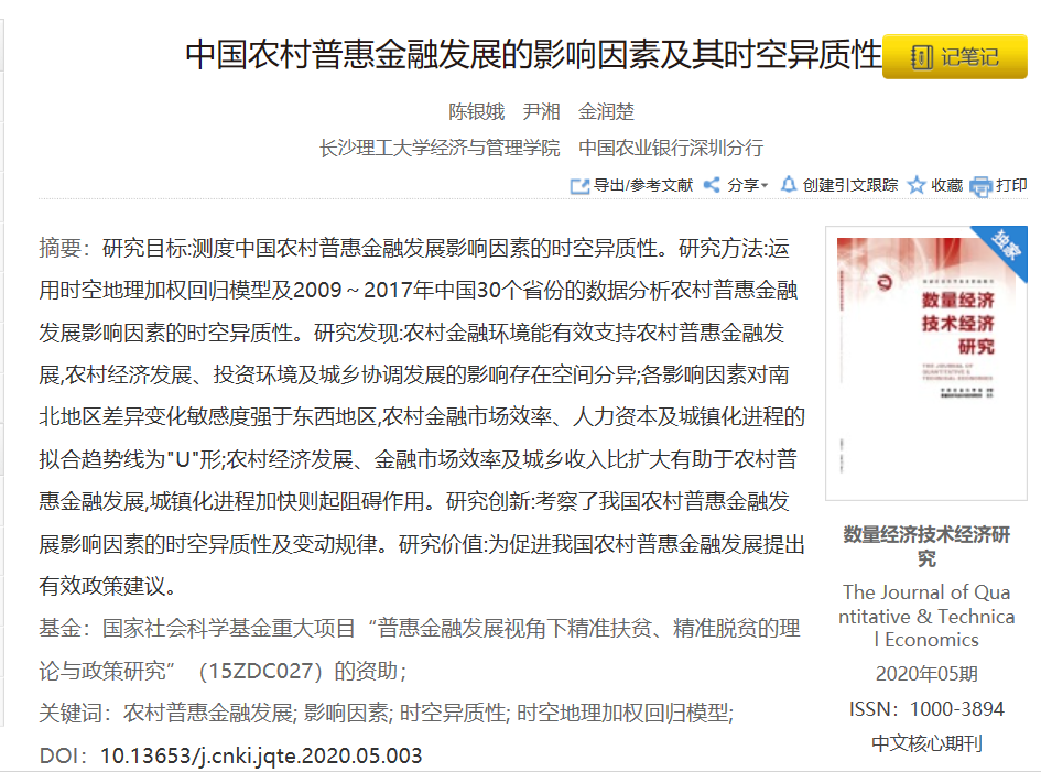 2020年5月,我校经管学院2018级应用经济学硕士研究生尹湘(第二作者)与导师陈银娥(第一作者)合作的论文《中国农村普惠金融发展的影响因素及其时空异质性》在权威期刊《数量经济技术经济研究》(2020年第5期)发表,是该院提高研究生培养质量的重要成果之一。