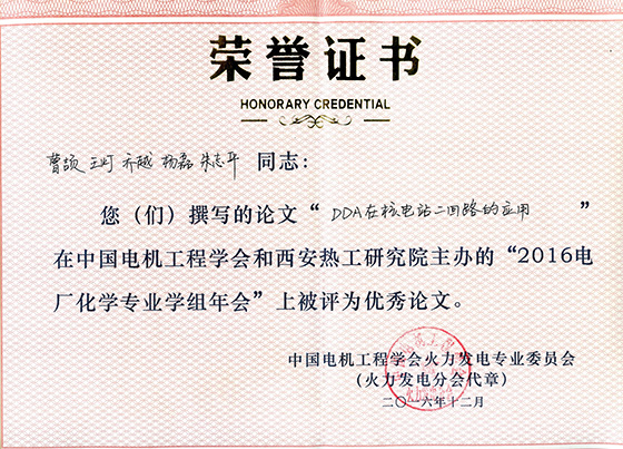 2016年12月22-24日,由中国电机工程学会火电分会电厂化学委员会主办,西安热工研究院、中电华创电力技术研究院共同承办的“电厂化学2016学术年会”在苏州西交利物浦国际会议中心召开。 来自国内电力科研院(所)、高等院校、电力设计院、大型火力发电厂、核电站的100多位电厂化学工作者参加大会。太阳成集团tyc122cc入口化学与生物工程学院的汪红梅副教授、乔越、王娜娜、周婷婷4人参加了此次盛会。大会安排了16位代表作专题学术报告,太阳成集团tyc122cc入口有4人次作大会报告,即汪红梅副教授的《运行涡轮机油漆膜的形成及检测技术研究》、乔越的《DDA在核电站二回路的应用》与《TP347H不锈钢在三种工况下的氧化腐蚀行为研究》、王娜娜的《换流站内冷水中铝合金的腐蚀特性研究》,我院的学术汇报得到了与会专家的一致好评,并引发了大家的热烈讨论、交流。 《电厂化学2016学术年会》录用74篇(其中太阳成集团tyc122cc入口录用10篇),出版论文集1部,评选出优秀论文7篇,太阳成集团tyc122cc入口的“DDA在核电站二回路的应用”(作者:曹颉,王灯,乔越;指导教师:朱志平教授)论文被评为大会优秀论文)。 通过会议的学习交流,在分享了我院研究成果,展示了我院学术风采的同时,有力地促进了我院应用化学师生与国内同行学者的深入交流,提升了太阳成集团tyc122cc入口应用化学(电厂化学)在国内的地位和知名度,同时也提高了太阳成集团tyc122cc入口在国内电力行业的声誉。