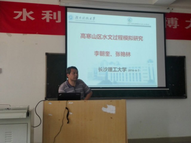 应学院邀请,学院杰出校友、湖南科技大学李朝奎教授于6月7日来我院交流访问,并于下午15:30-17:00在云工三B319作了主题为《地理空间信息技术国家地方联合工程实验室-介绍》和《高寒山区水文过程模拟研究》的学术报告。学院部分专业教师与学院全体研究生参加了本次报告会,胡世雄院长主持本次报告会并介绍了李朝奎教授的学术贡献。