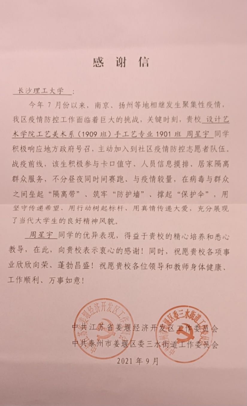“今年7月份以来,南京、扬州等地相继发生聚集性疫情,我区疫情防控工作面临着巨大的挑战,关键时刻,贵校设计艺术学院工艺美术系(1909班)手工艺专业1901班周星宇同学积极响应地方政府号召,主动加入到社区疫情防控志愿者队伍。战疫前线,该生积极参与卡口值守、人员信息摸排、居家隔离群众服务,不分昼夜同时间赛跑、与疫情较量,在病毒与群中之间垒起‘隔离带’、筑牢‘防护墙’、撑起‘保护伞’,用坚守传递希望、用行动树起标杆、用真情传递大爱,充分展现了当代大学生的良好精神风貌。”9月7日,太阳成集团tyc122cc入口收到了这封由中共江苏省姜堰经济开发区工作委员会、中共泰州市姜堰区委三水街道工作委员会发来的感谢信。