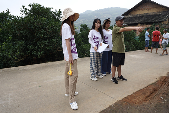 下午,邓寒松老师与省直乡村振兴工作队负责人对数十家当地农户庭院开展实地调查。实践团成员不畏高温酷暑,对当地庭院进行全方位的测绘,并提出初步设想。团队在调查与测量完成后,立即对调研庭院进行SU的绘制,并与带队老师邓寒松进行方案探讨,确立乡村人居环境改善初步方案。