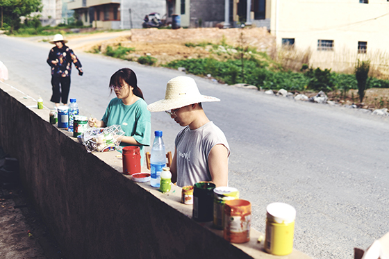 黎明时分,团队成员出发前往村委会指定墙面进行主题墙绘。经过实地勘测与讨论决定主要以环境保护、美丽乡村等主题进行墙绘设计及绘制。从调色到刷漆上色,再到细节刻画和收尾,艺术学子协调配合,每一步都严谨认真,用笔尖描绘出新农村的新风貌,用艺术激发出乡村的内生动力,努力为坪山村注入新活力。