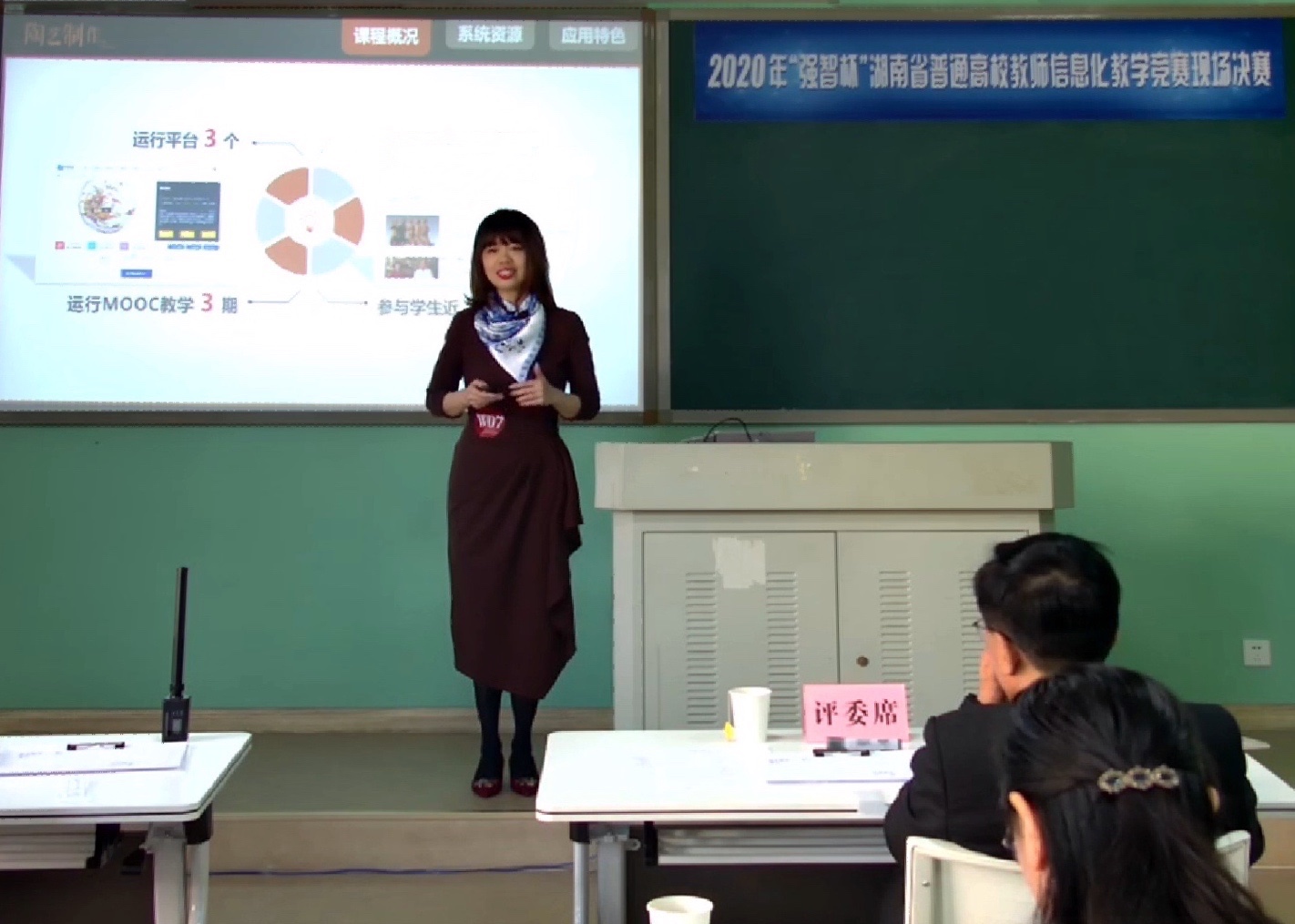 11月15日,2020年湖南省普通高校教师信息化教学竞赛决赛在长沙学院落幕,经过学校初赛、湖南省教育厅组织的复赛和现场决赛,我院蒋瑛老师以文科组总成绩第二名斩获文科组一等奖。
