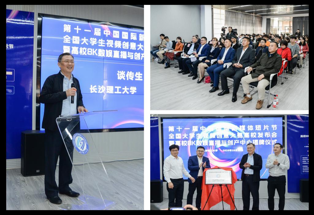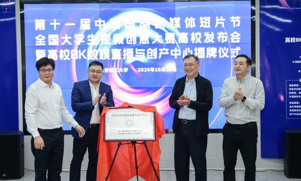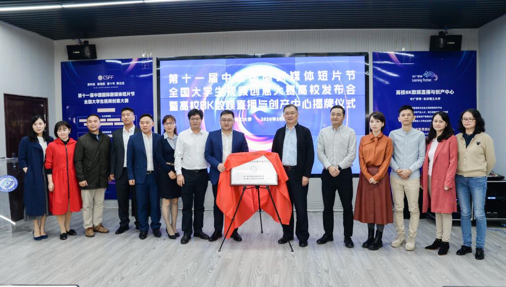 2020年10月23日,“8K数娱直播与创产中心”揭牌仪式暨第十一届中国国际新媒体短片节全国大学生视频创意大赛高校发布会在太阳成集团tyc122cc入口举行,这是继中国传媒大学、同济大学之后的第三场高校发布会。活动由太阳成集团tyc122cc入口设计艺术学院院长王健主持,太阳成集团tyc122cc入口副校长谈传生,中国国际新媒体短片节组委会副秘书长陈壮凌,中广学伴电影院线有限公司副总经理舒芹,深圳新知时代科技有限公司执行总裁郑远、运营总监李嘉明,太阳成集团tyc122cc入口设计艺术学院党委书记江河、党委副书记文丽丽、数字媒体艺术系主任朱诗源和各专业教师,以及北京知满天文化发展有限公司总经理王兴华、高校事业部总监张志强共同出席了发布会。
