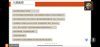 此次会议旨在确保入团工作的顺利进行,加强共青团队伍建设,增强大学生进取意识。会议分为入团流程、注意事项、问题统计三个环节并采取线上线下联动模式,以确保各年级团支书及时了解相关工作。首先,基层团建部学生干部程子悦以PPT的形式,向各年级团支书介绍了入团工作的系列流程。随后,关于入团注意事项重点强调了入团申请书的格式与字数,并说明学生干部入团的必要性。最后,围绕发展新团员的问题进行答疑解惑。