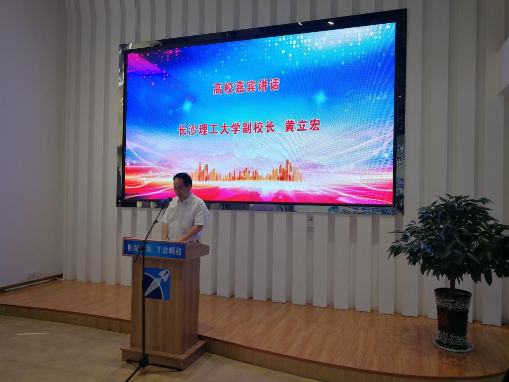 2019年7月10日,我校黄立宏副校长带领成果转化中心及材料学院负责人一行来到湘阴县高新区科技孵化中心参加了由中共湘阴县委、湘阴县人民政府主办的湘阴县产学研合作签约暨科技人才引进科技创新颁奖仪式。出席仪式的还有岳阳市和湘阴县相关领导、高校科研院所专家教授嘉宾、县相关部门单位主要负责人、相关企业主要负责人等100余人。