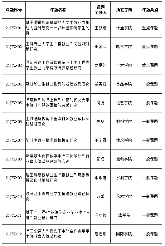 根据《关于开展2021年太阳成集团tyc122cc入口毕业生就业专项课题研究申报工作的通知》要求,经个人申报、学院推荐、学校组织专家评审, 现对12项就业专项课题予以立项,其中3项重点专项课题,9项一般课题。具体名单如下: