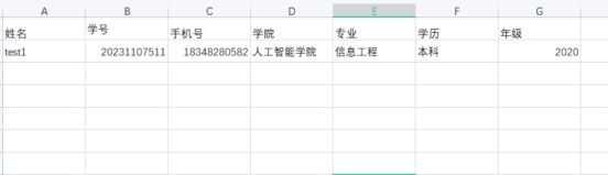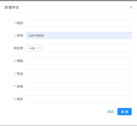 支持学院、专业、年级、学历和时间范围进行筛选,通过学号、姓名和手机号进行搜索;