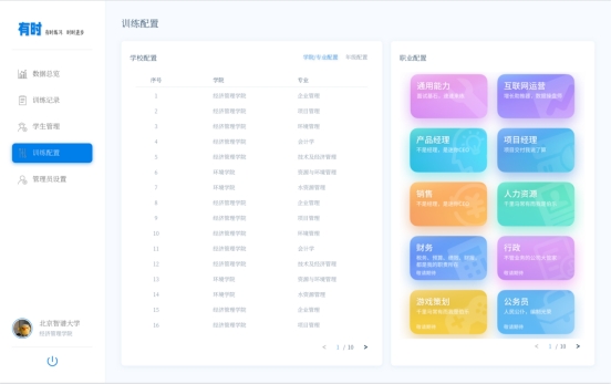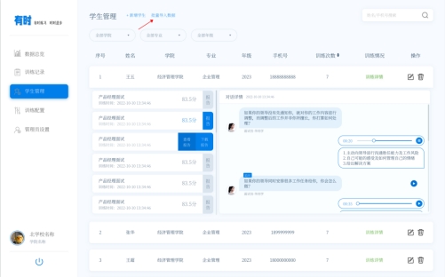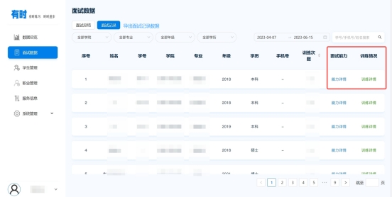 包含学生维度的基本信息及训练情况,支持查看学生能力详情、多场次面试对话及成绩、面试报告;
