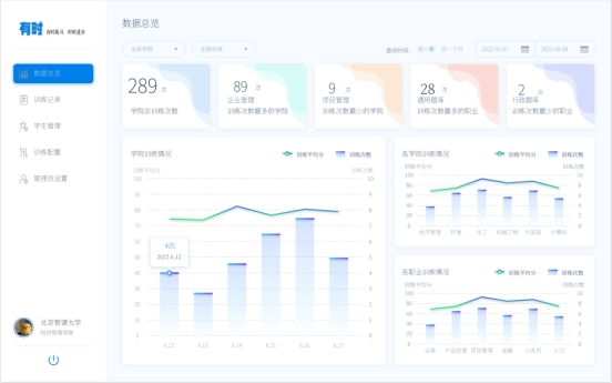 【数据总览】将学生的面试训练数据按照不同维度,不同颗粒度进行划分汇总,直观的呈现总体训练情况,便于管理人员了解学生训练的整体情况和汇总数据用于向上汇报。
