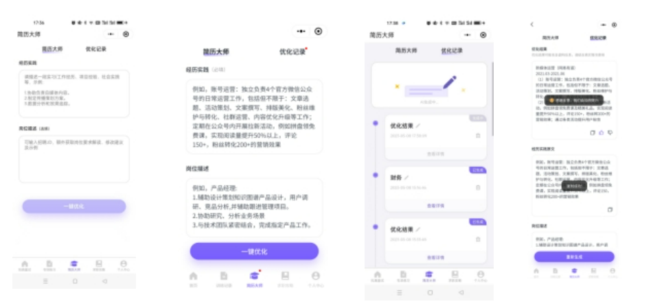 优化记录:记录用户的每一次优化,支持名称修改、删除。优化详情包括优化结果、经历实践原文、岗位描述,支持一键复制、一键编辑重新生成、点赞点踩反馈。