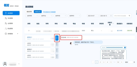 点击面试记录,同步“面试总结”筛选范围,从面试总结数据一键切换至学生及面试场次维度详情